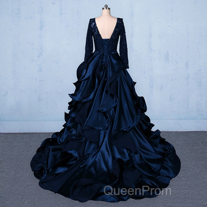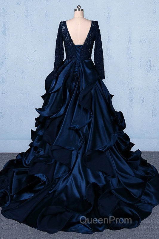 Formal V-neck Beading Lace Satin Backless Ball Gown Evening Prom Dresses With Sleeves