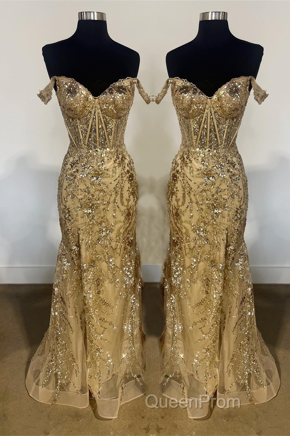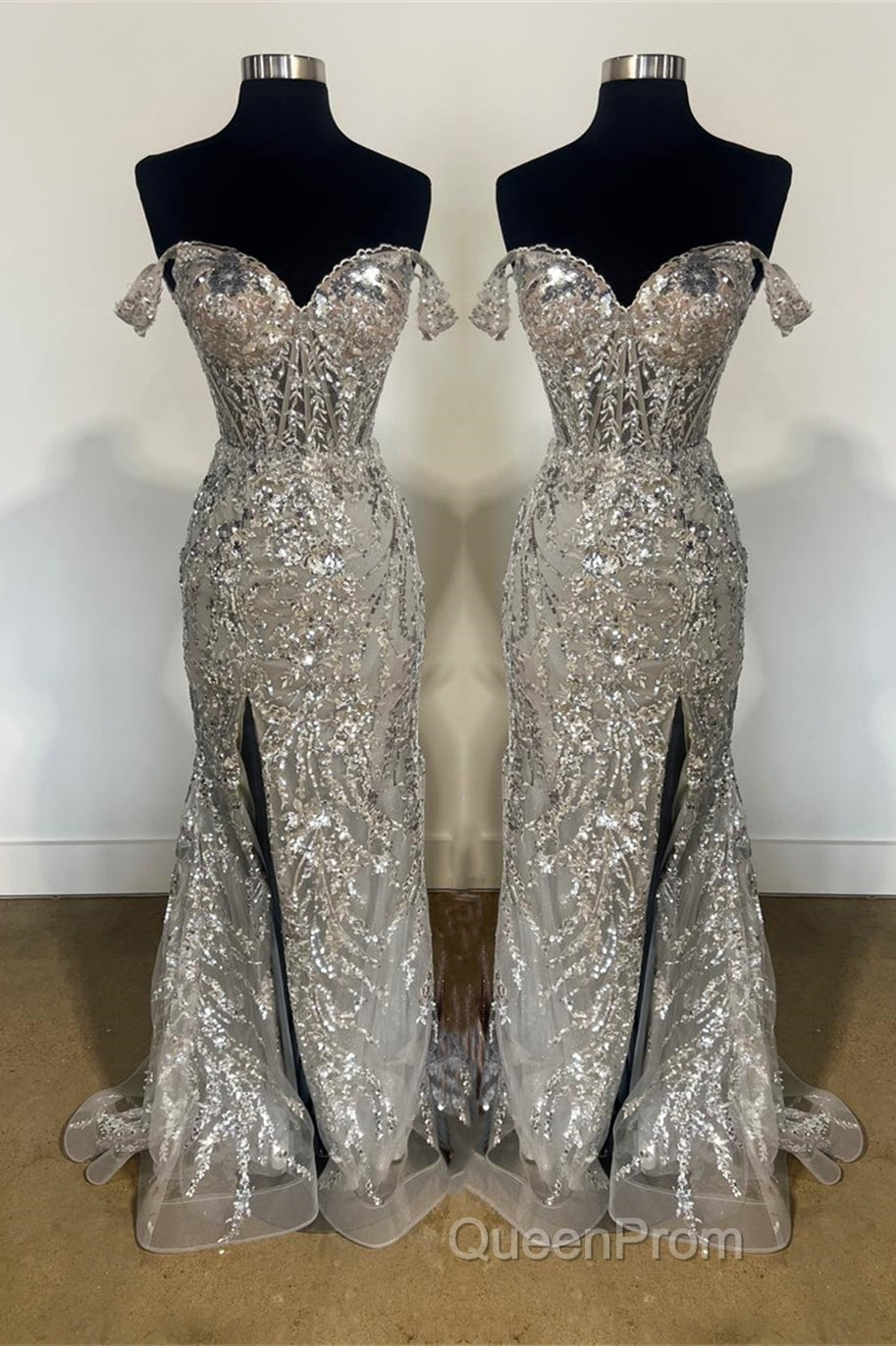 Fuchsia Off-Shoulder Sequined Floral Mermaid Long Evening Prom Dresses with Slit