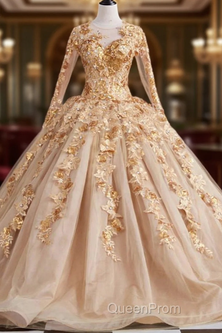 Gold Long Sleeves Wedding Dresses Ball Gowns Lace Embroidery