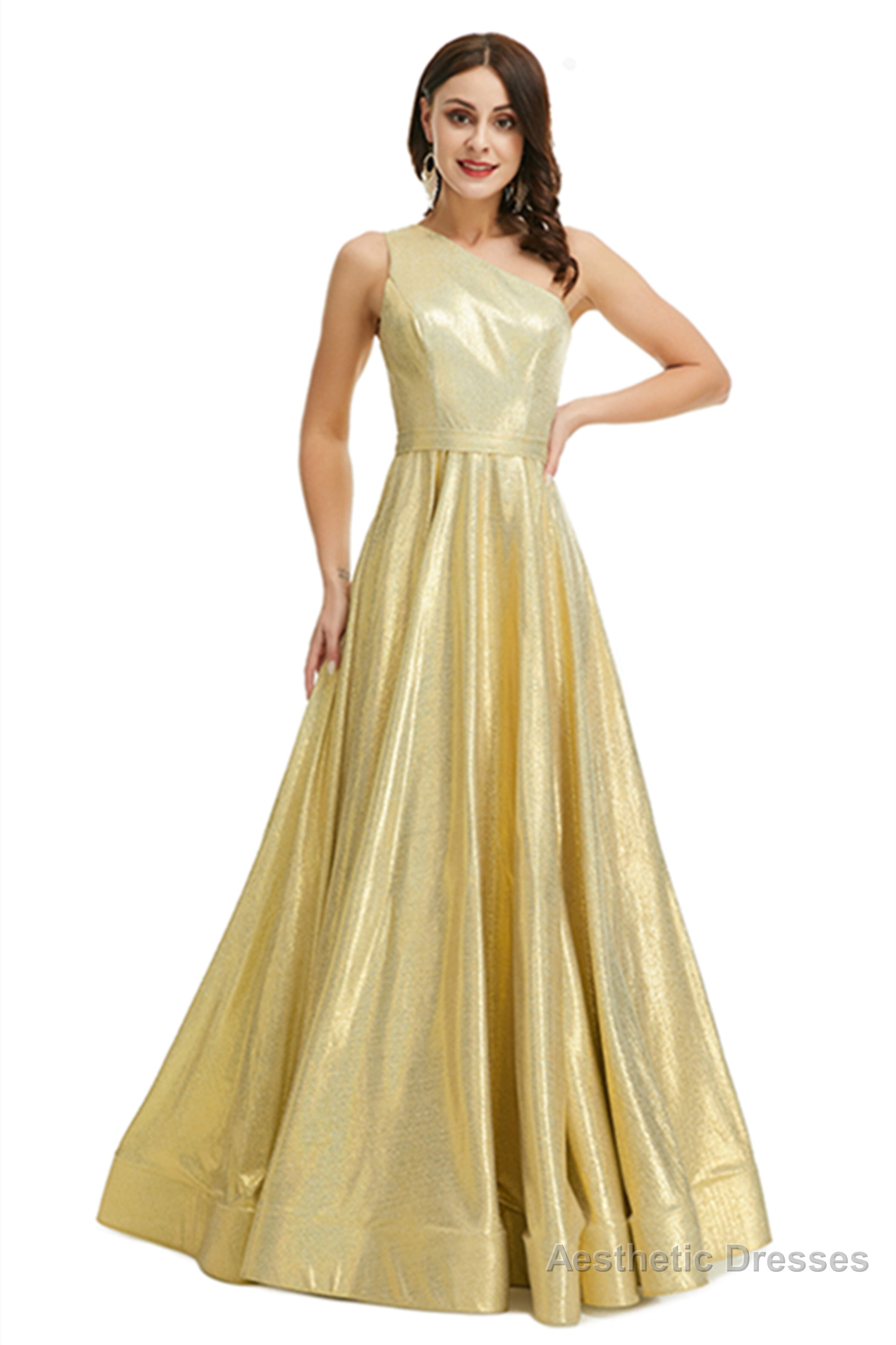 Gold Satin One Shoulder With Split Prom Dresses