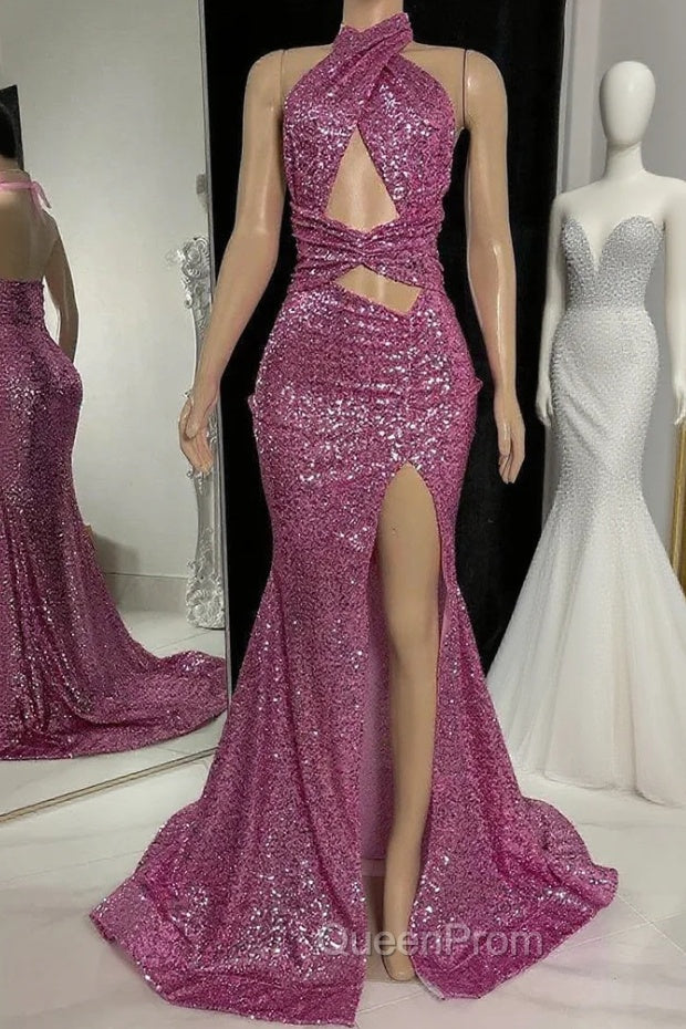 Gorgeous Halter Pink Evening Prom Dresses Sequins Sleeveless Long With Split