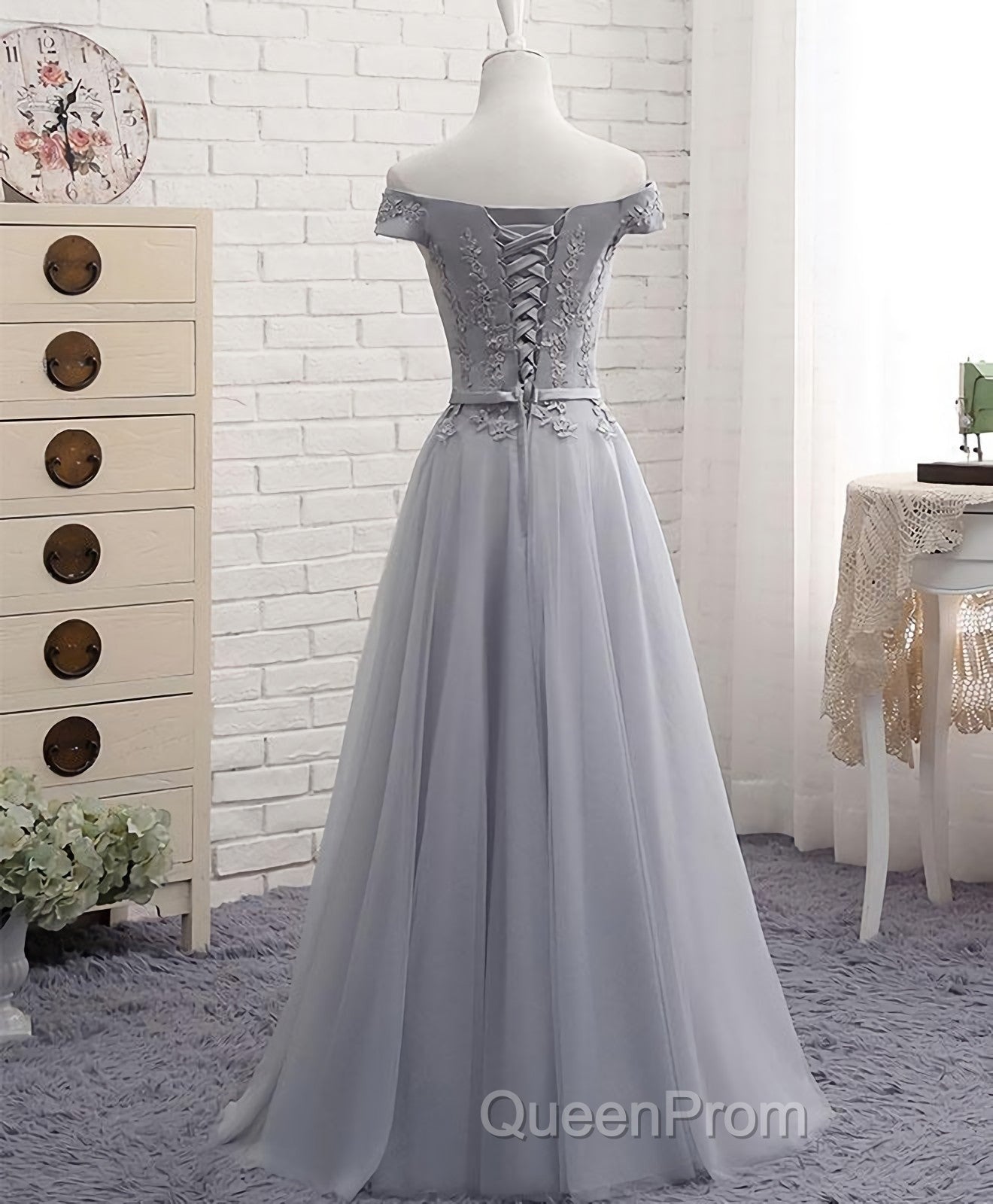 Gray A Line Lace Off Shoulder Evening Prom Dresses, Lace Evening Dresses