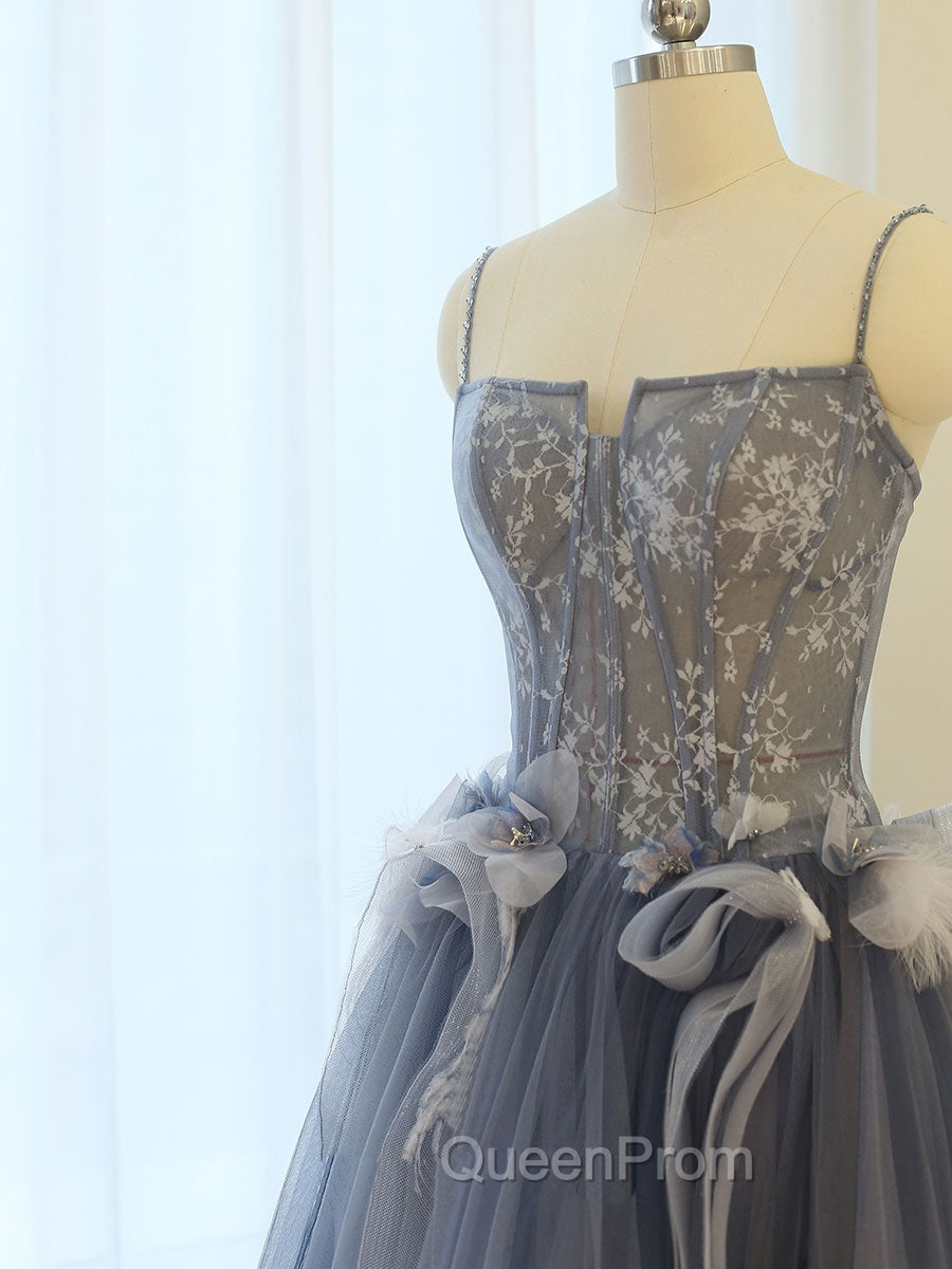 Gray A Line Lace Tulle Long Evening Prom Dresses, Gray Evening Dresses