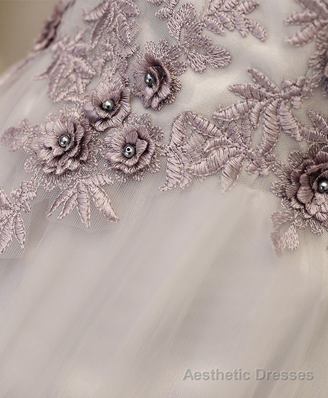 Gray A Line Off Shoulder Knee Length Prom Dress, Lace Homecoming Dresses