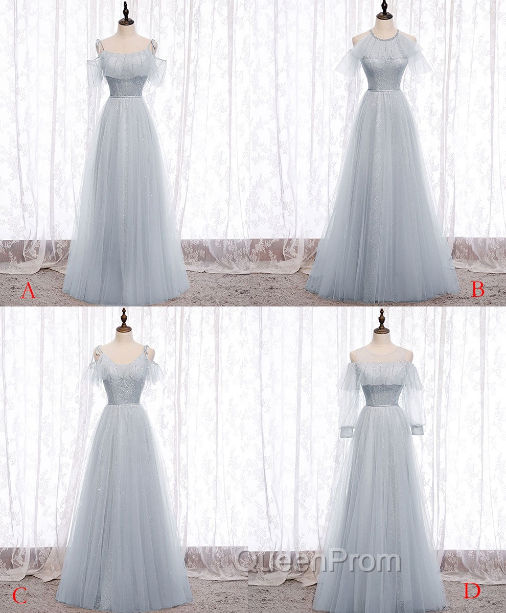 Gray A line Tulle Long Evening Prom Dresses, Gray Evening Bridesmaid Dresses