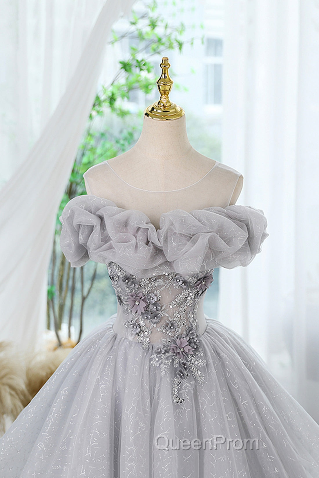 Gray Scoop Neckline Tulle Sequins Short Evening Prom Dresses, A-Line Off The Shoulder Evening Party Dresses