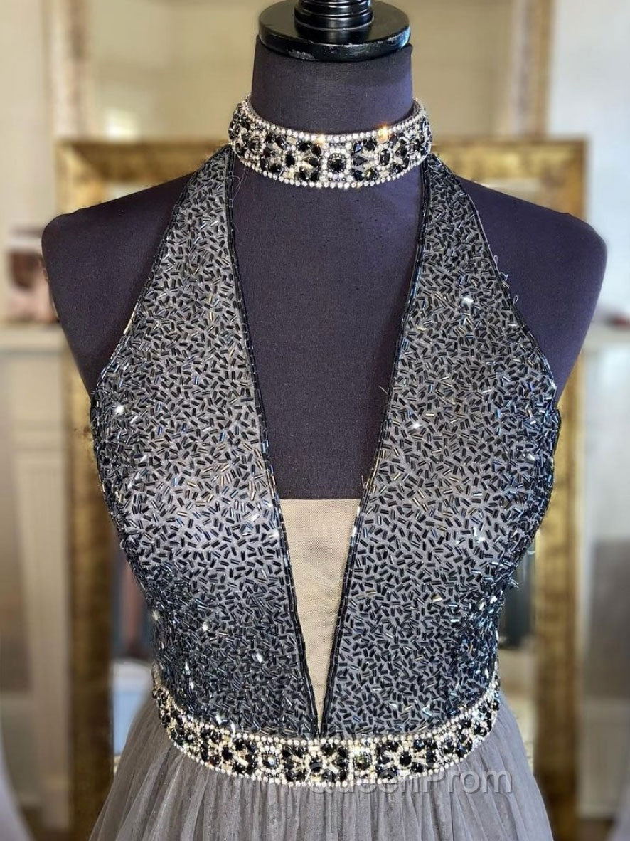 Gray v neck tulle beads long Evening Prom Dresses, gray tulle formal Dresses