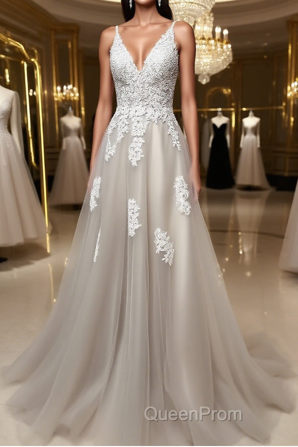 Gray v neck tulle lace long Evening Prom Dresses, gray tulle evening Dresses