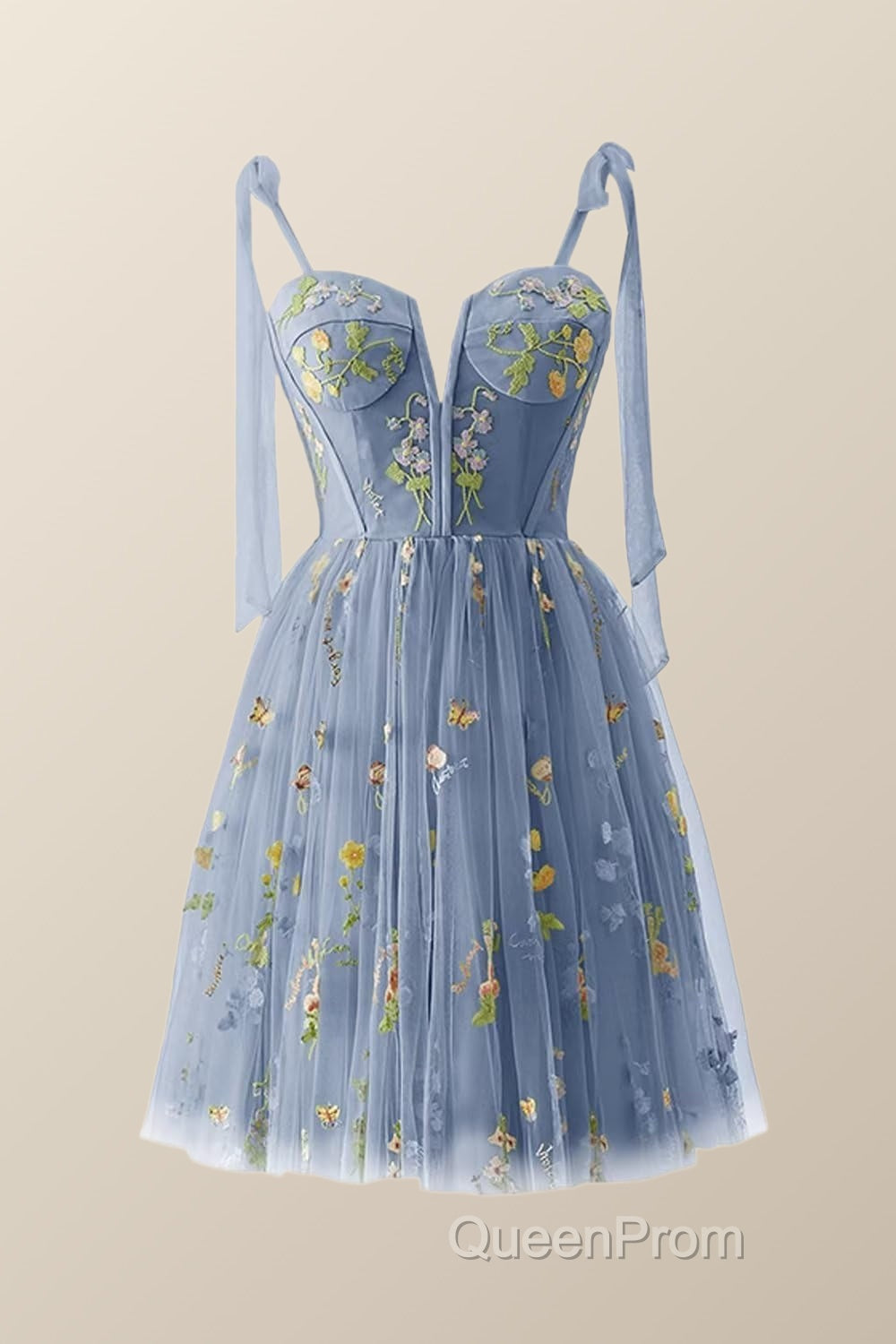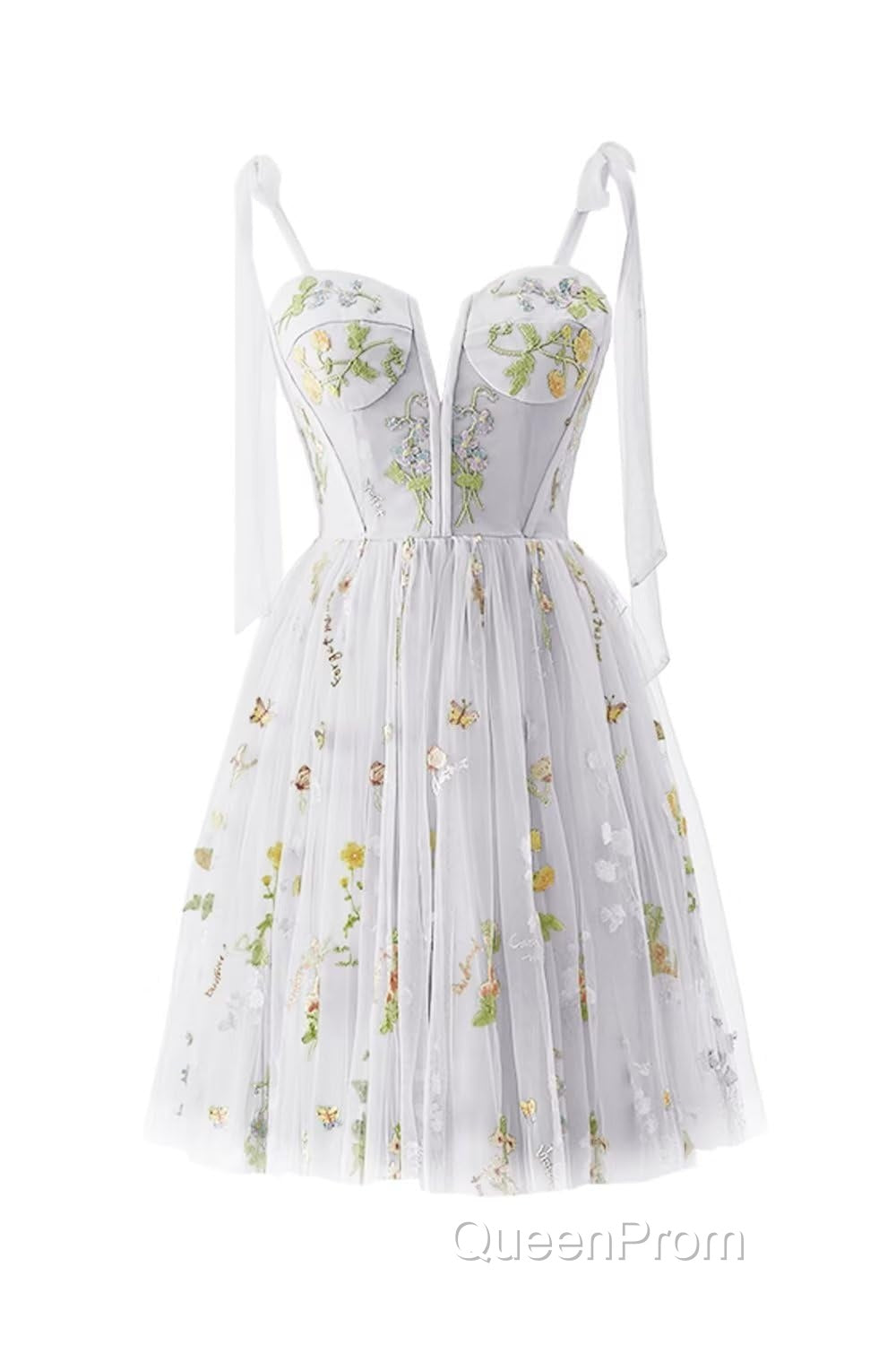 Green Floral Tulle A-line Short Dresses with Tie Shoulders