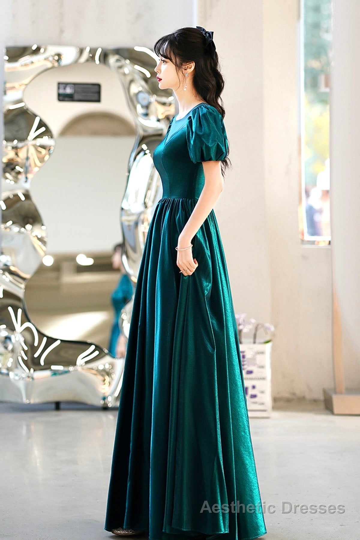 Green satin long prom dress A-line evening dress