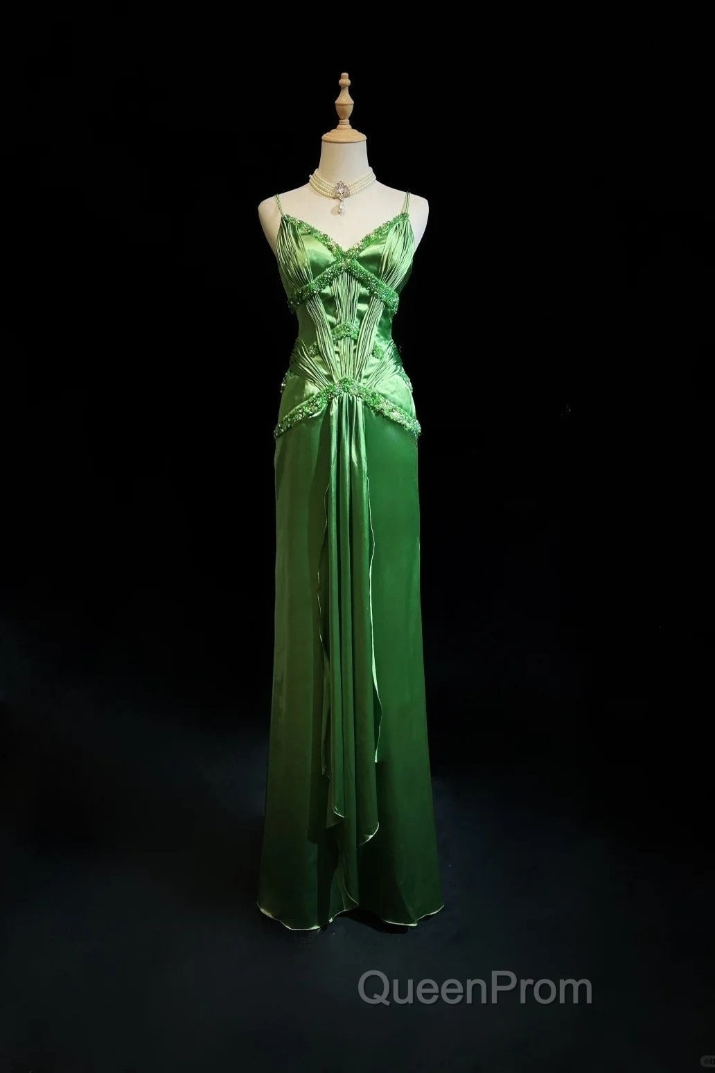 Green Spaghetti Strap Sheath Satin Beaded Evening Prom Dresses Evening Gown