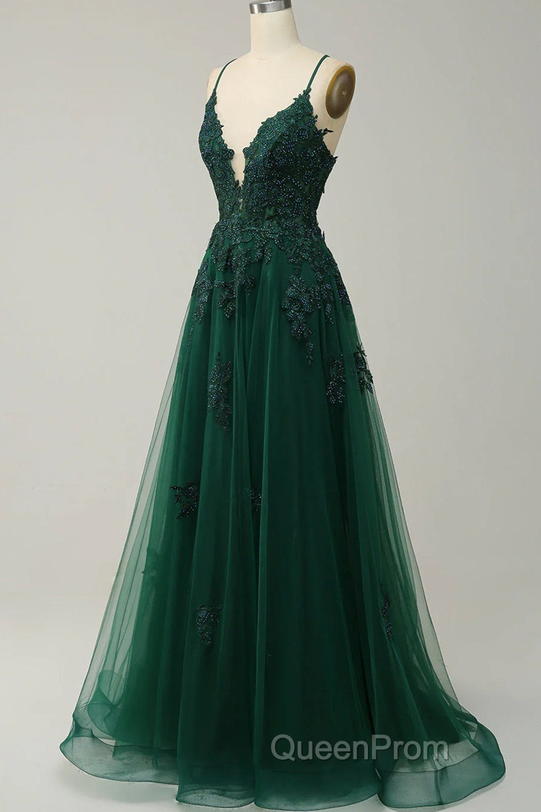 Green V-Neckline Tulle With Lace Cross Back, Green Tulle Evening Prom Dresses