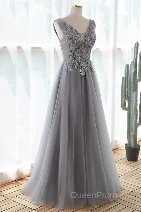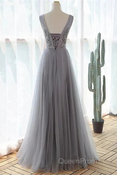 Grey A-Line Tulle With Lace Long Formal Dresses V-Neckline Evening Prom Dresses Sleeveless December Wedding Guest Dresses