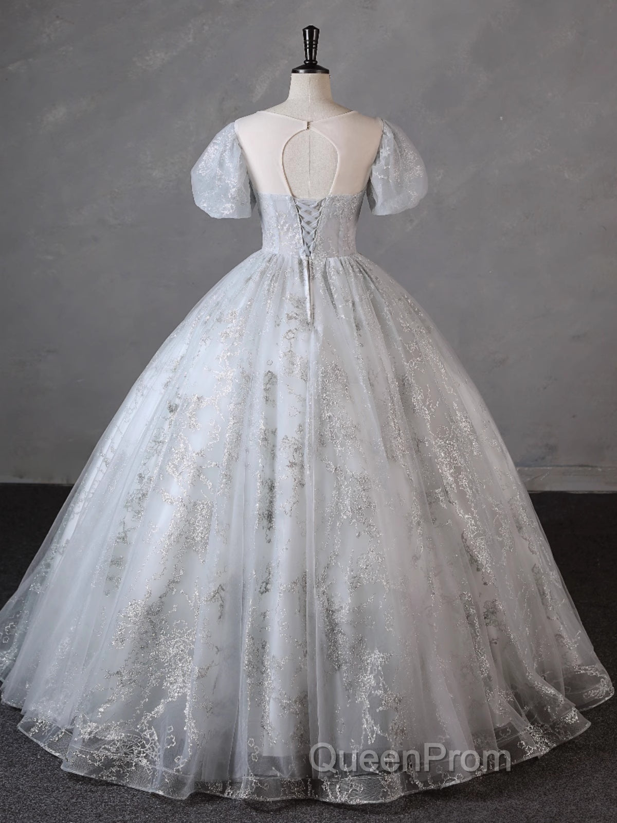 Grey Short Sleeves Tulle Ball Gown Evening Prom Dresses, Grey Ball Gown Sweet 16 Dresses
