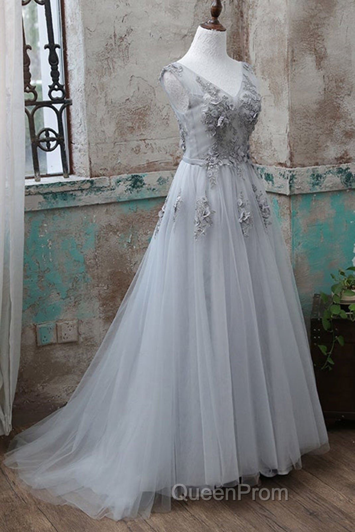 Grey V-Neckline Tulle With Lace Long Formal Dresses, Grey A-Line Evening Prom Dresses