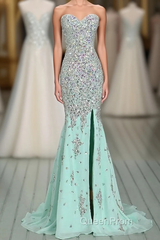High Quality Mermaid Rhinestones Long Sexy Sweetheart Front Split Mint Chiffon Trumpet 2024Evening Prom Dresses