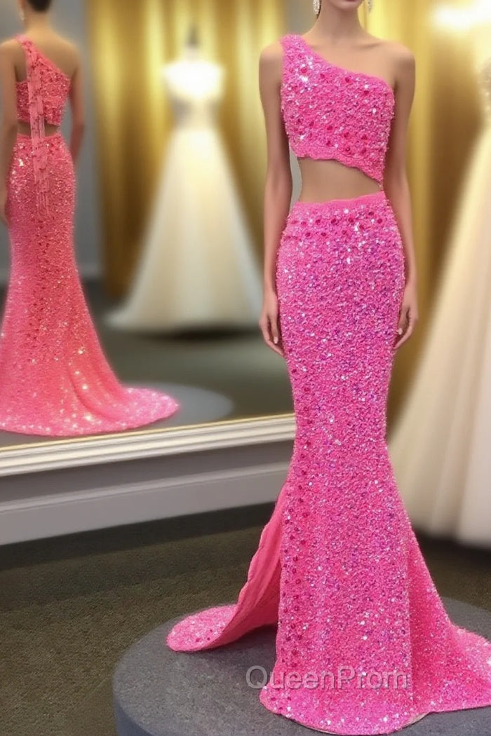 Hot Pink One Shoulder Sequins Evening Prom Dresses with Slit