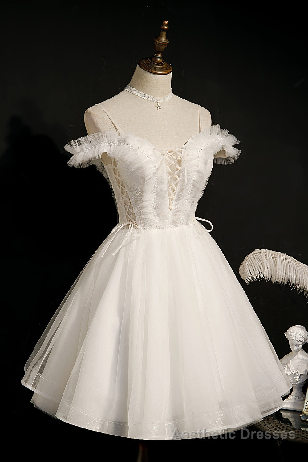 Ivory Spaghetti Strap Beaded Tulle Short Princess Homecoming Dresses