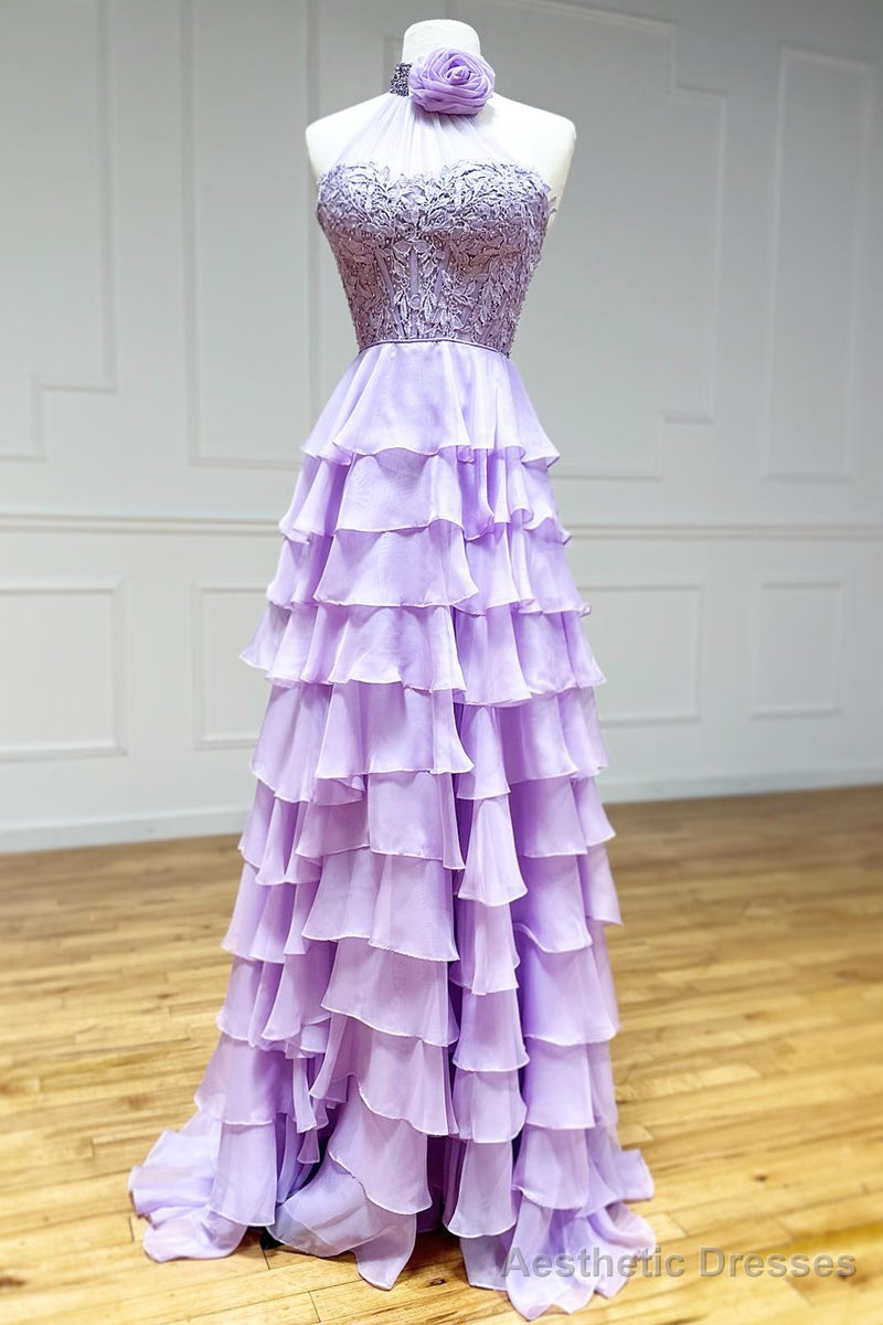 Lavender Long Tiered Prom Dress Ruffle High Neck With 3D Flower