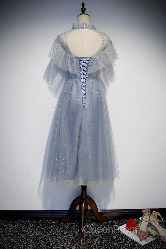 Light Blue Shiny Tulle High Neckline Homecoming Dresses Party Dresses, Blue Short Evening Prom Dresses