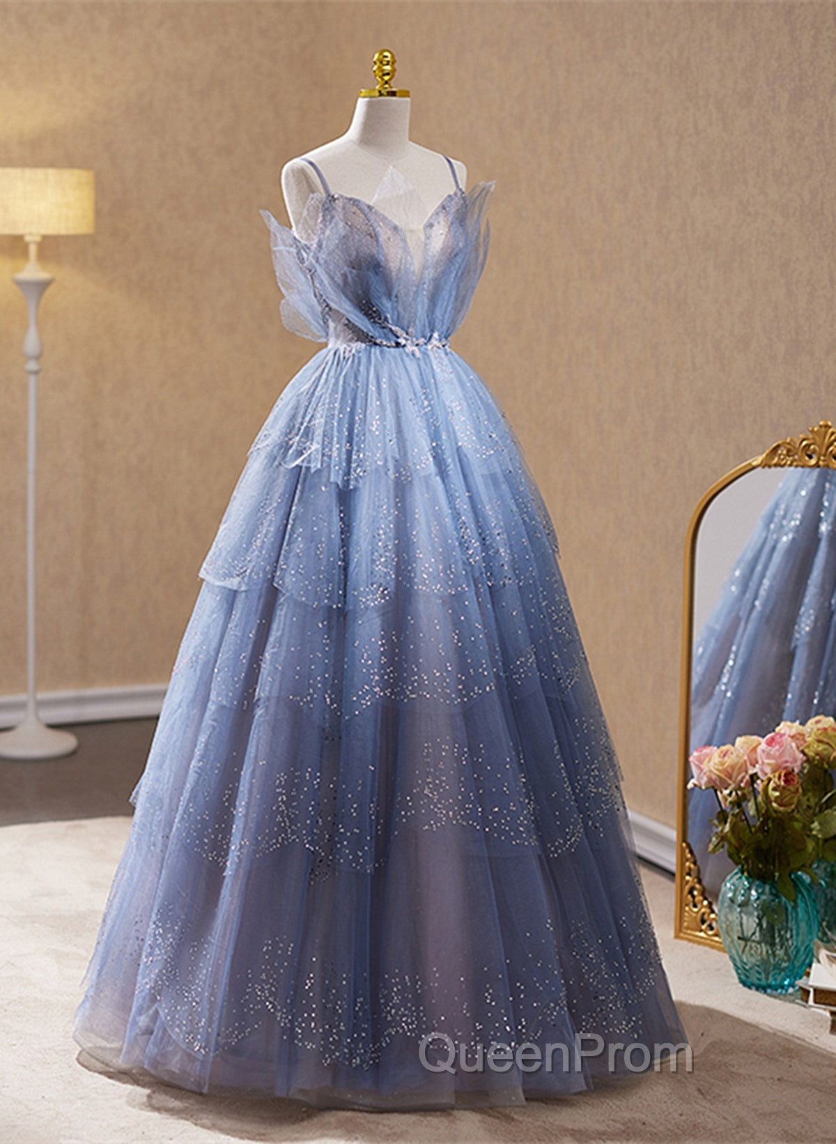 Light Blue Tulle Beaded Long Formal Dresses, Light Blue Shiny Tulle Evening Dresses Evening Prom Dresses