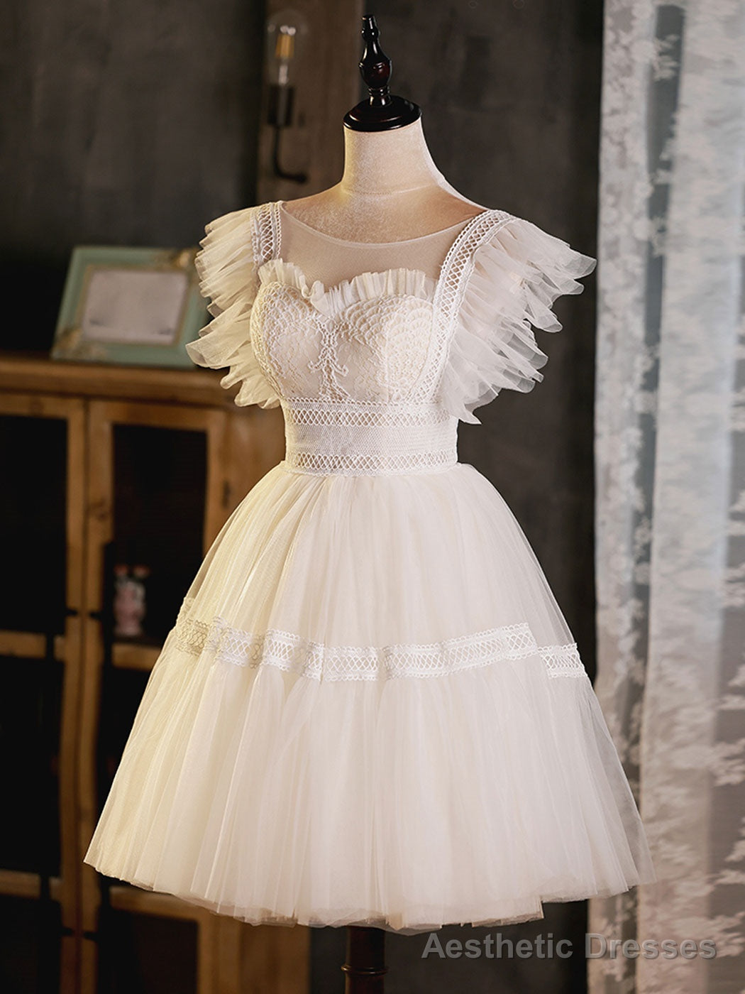 Light Champagne Round Neck Tulle Lace Short Prom Dress, Puffy Homecoming Dress