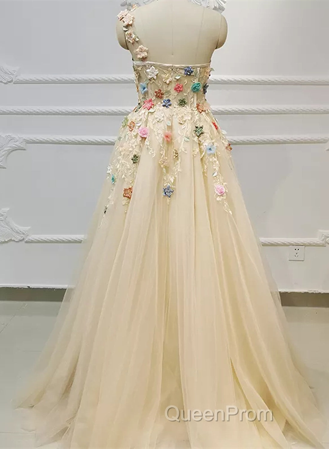 Light Champagne Tulle With Flowers Long Evening Dresses, A-Line Tulle Formal Dresses