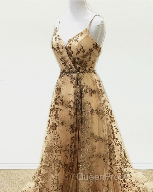Light Gold Sequin Pattern Evening Prom Dresses V Neck Split