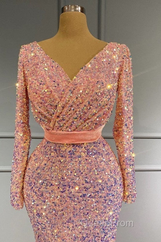 Long Sleeve Pink Mermaid Sequin Evening Prom Dresses