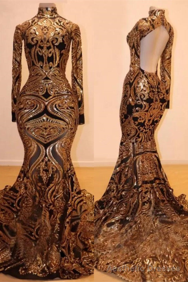 Long Sleeves Mermaid Prom Dress Gold Appliques Open Back