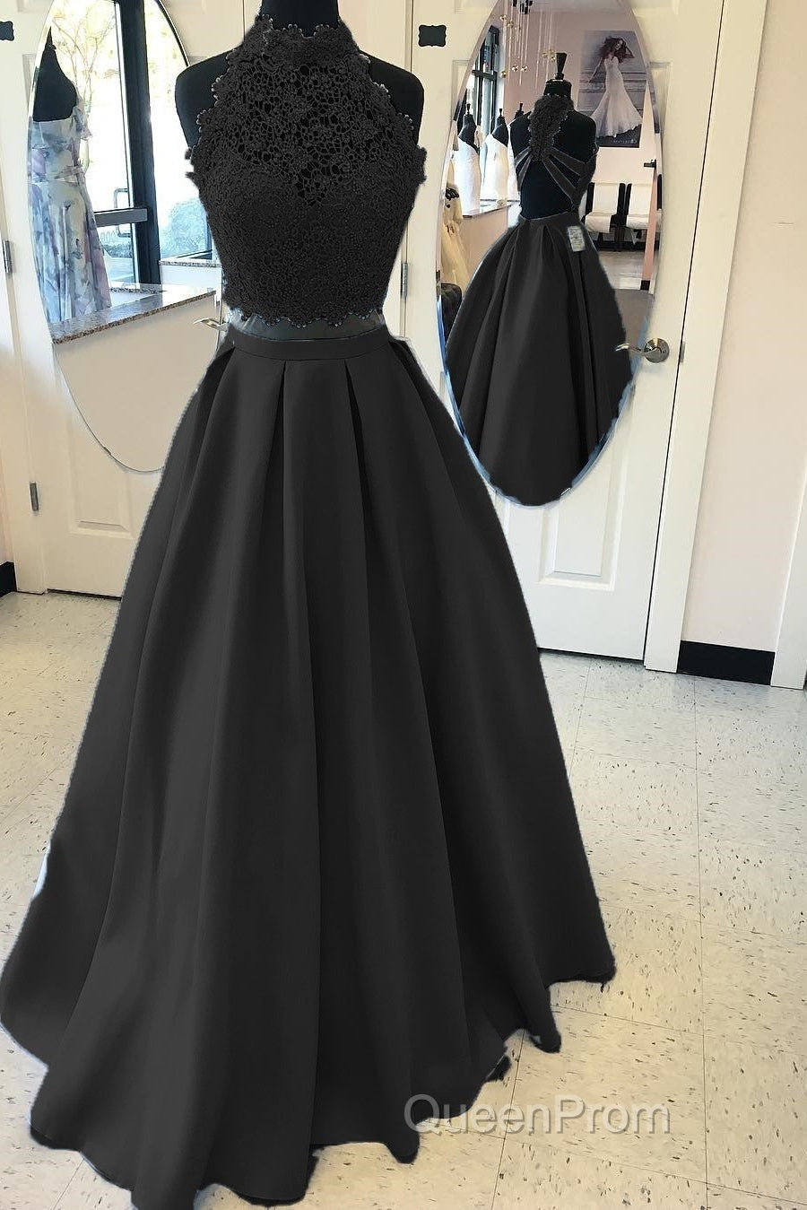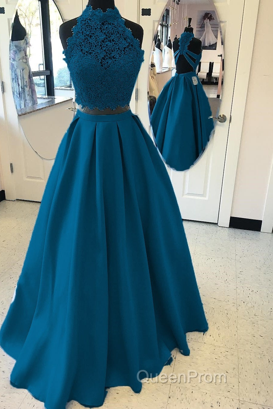 Long Two Piece Evening Prom Dresses Lace High Neck Open Back
