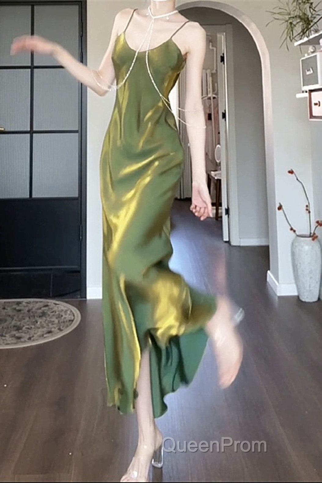 Lovely Green Straps Long Formal Dresses, Green Satin Party Dresses Evening Dresses