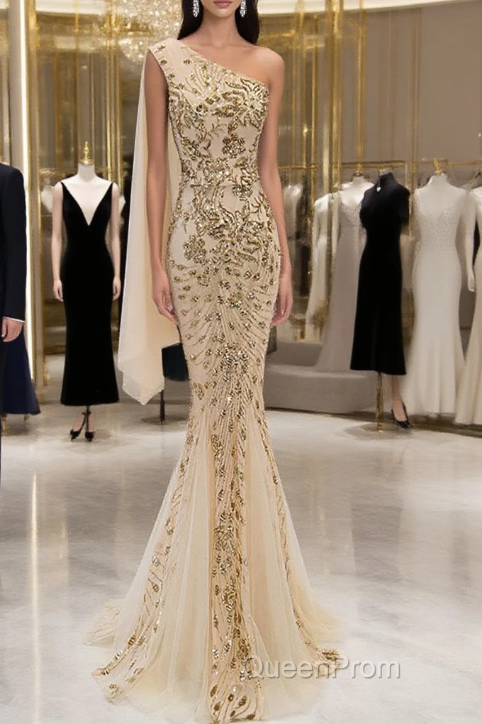 Lovely One Shoulder Champagne Sequins Mermaid Evening Prom Dresses, Champagne Evening Dresses