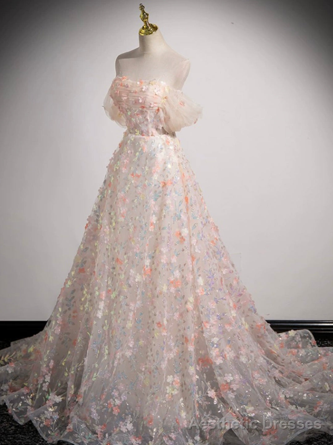 Lovely Three-dimensional Floral Floor Length Prom Dress, Off the Shoulder Evening Party Dress