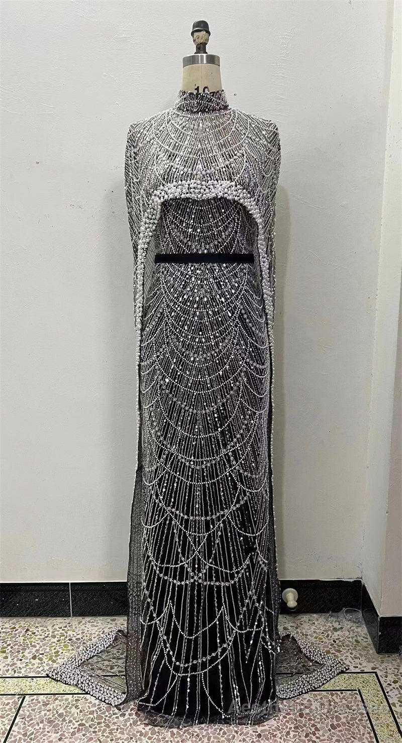 Luxury Pearls Beading Prom Dresses Sweep Train High Neck Zipper Sleeveless Evening Dresses