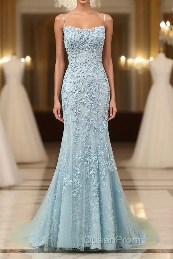 Mermaid Blue Long Evening Prom Dresses Backless Evening Dresses