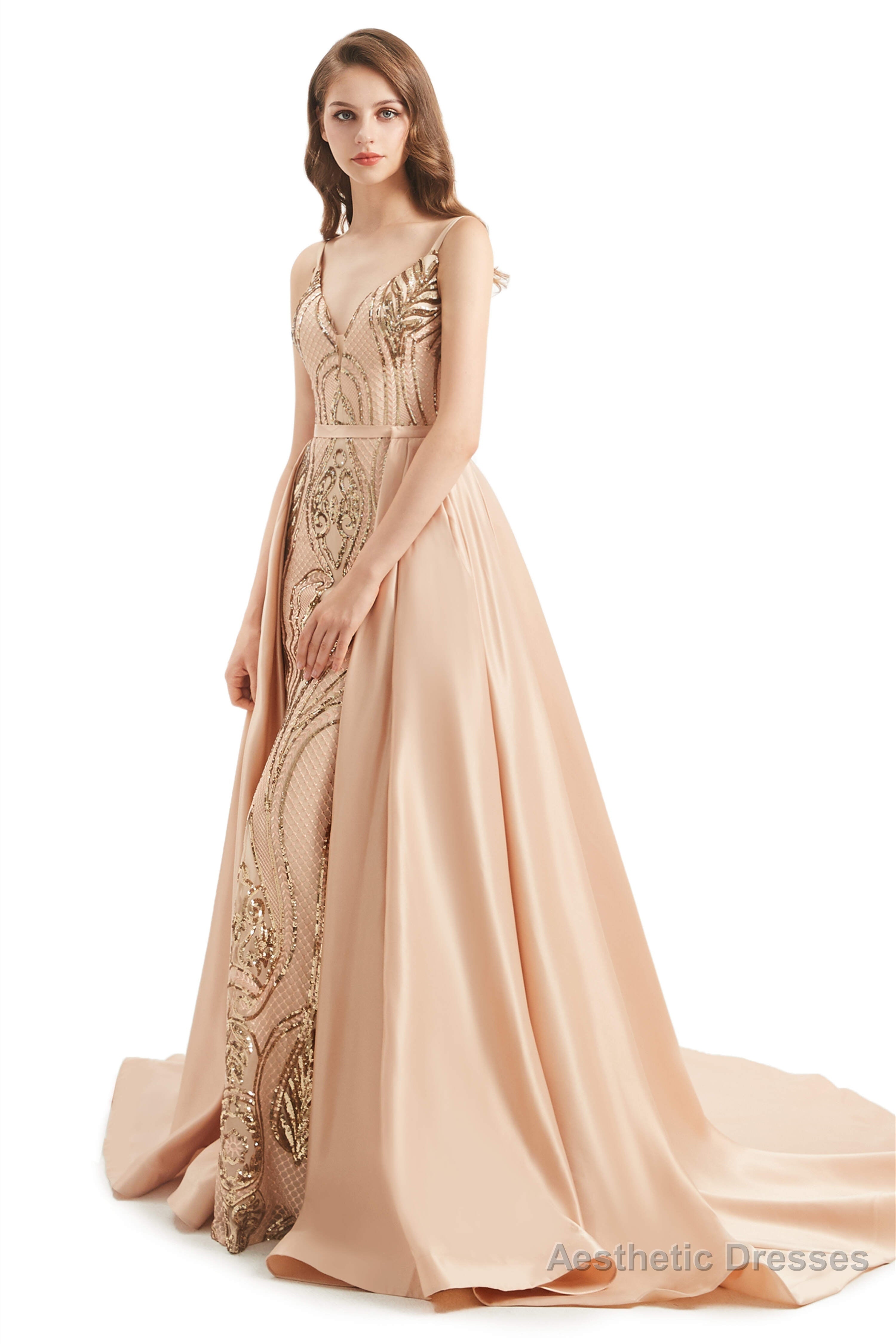 Mermaid Sequins Spaghetti Straps Prom Dresses With Detachable Train