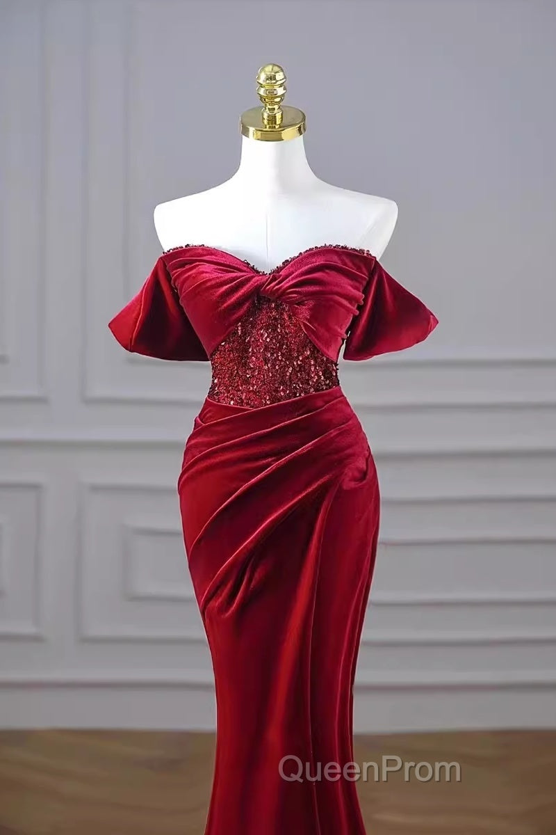 Mermaid Strapless Burgundy Velvet Evening Prom Dresses Evening Dresses