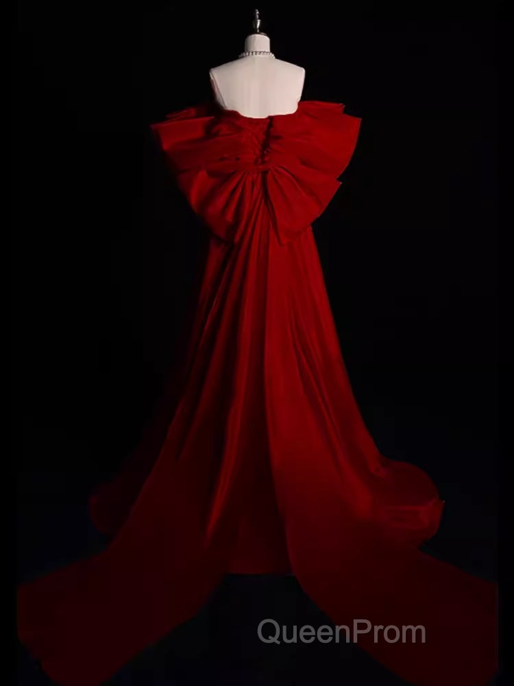 Modest A Line Strapless Long Short Sleeves Satin Red Evening Prom Dresses