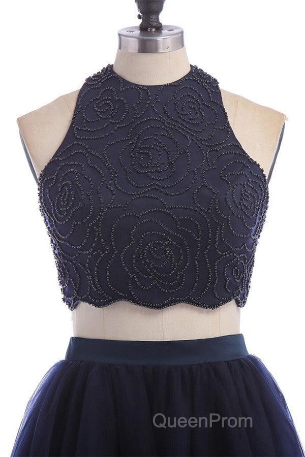 Modest Two Pieces Sleeveless Hollow Navy Blue Homecoming Dresses