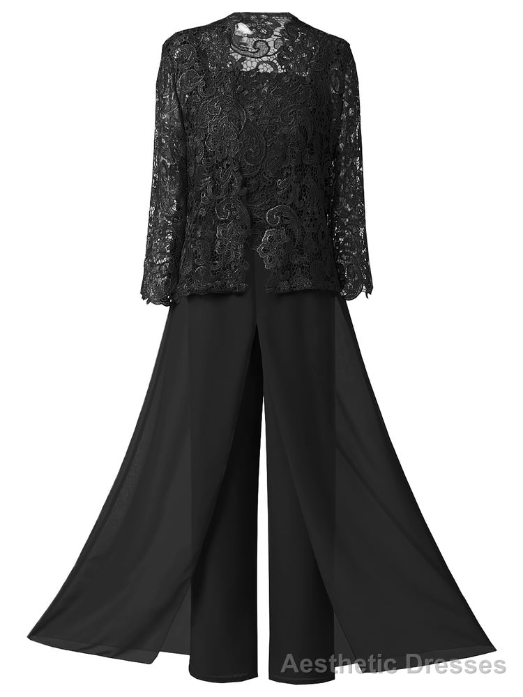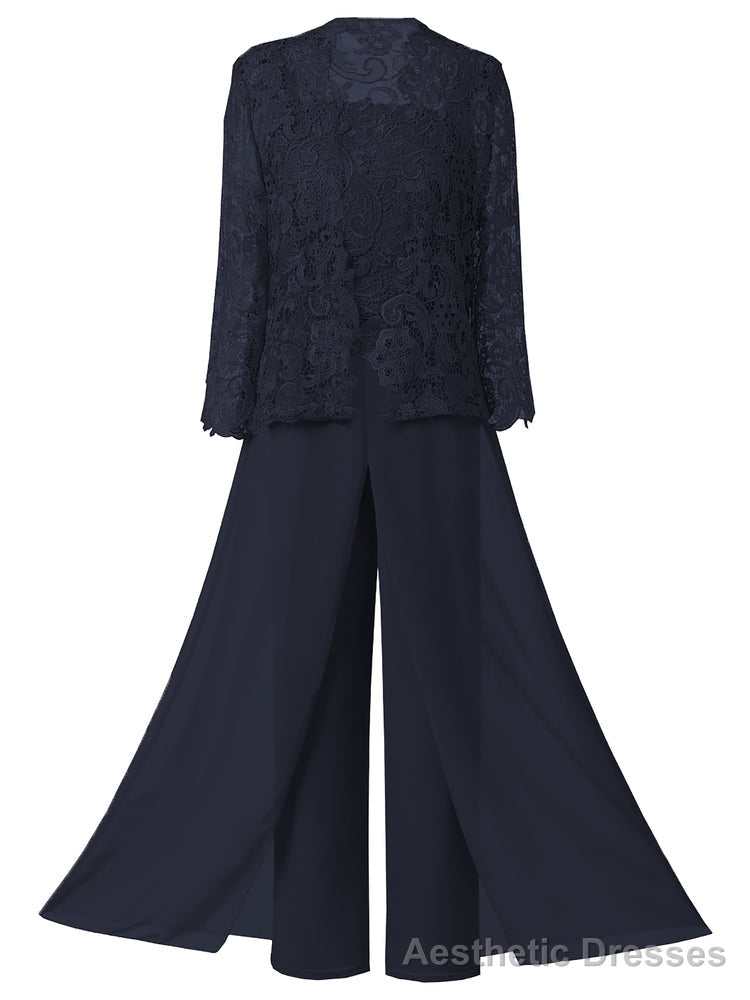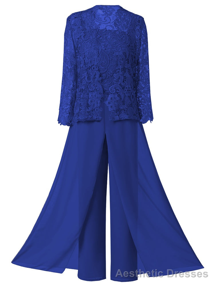 This ensemble features lace chiffon and is available in plus size, making it perfect for the mother of the bride. Each set includes three pieces: a dress, jacket, and pants.
