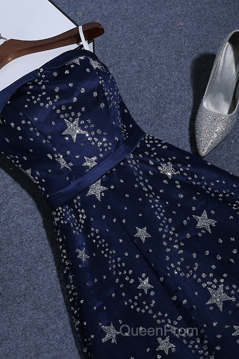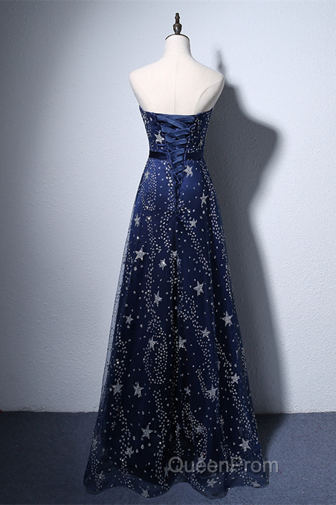 Navy Blue A-Line Tulle Long Evening Dresses, Navy Blue Evening Prom Dresses