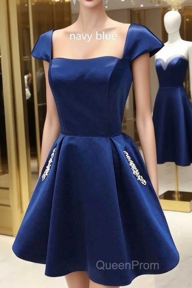 Navy Blue Satin Short A-Line Homecoming Dresses With Cap Sleeves And Beaded Pockets