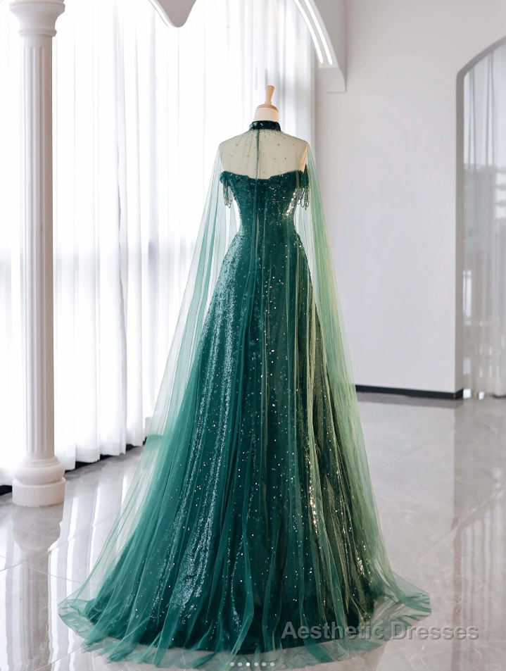 New A-Line Dark Green Prom Dress, Off-The-Shoulder Prom Dress With Cape, Sweeping Tail Prom Dress