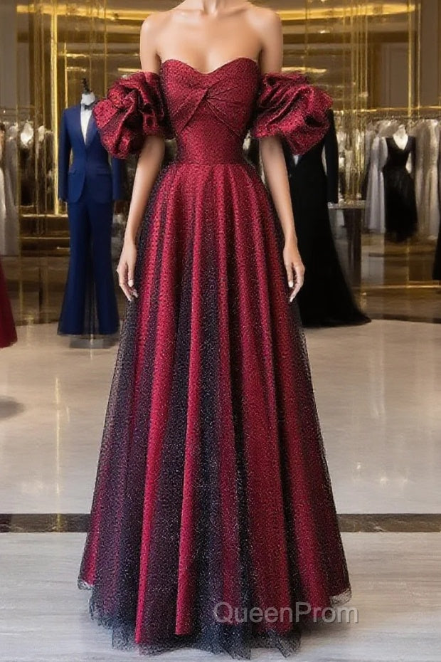 Off Shoulder Wine Red Sweetheart Tulle Evening Prom Dresses, A-line Wine Red Evening Dresses