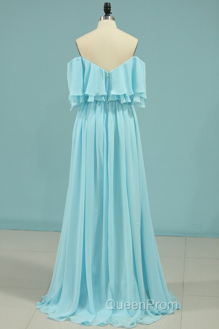 Off the Shoulder Blue Flounce Chiffon Long Bridesmaid Dresses