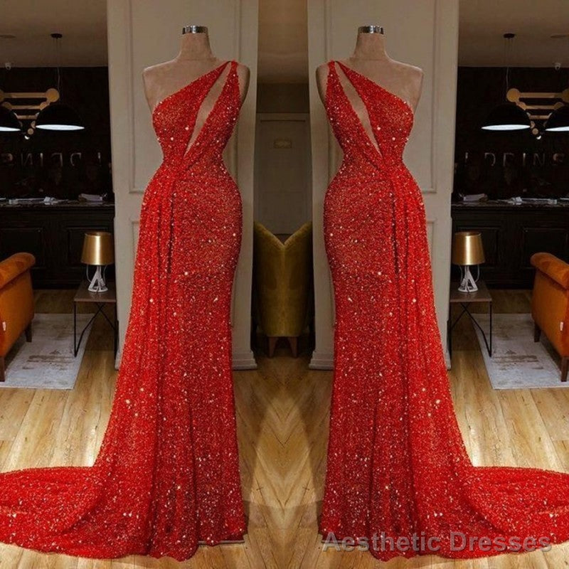 One Shoulder Red Prom Dress Sequins Long On Sale