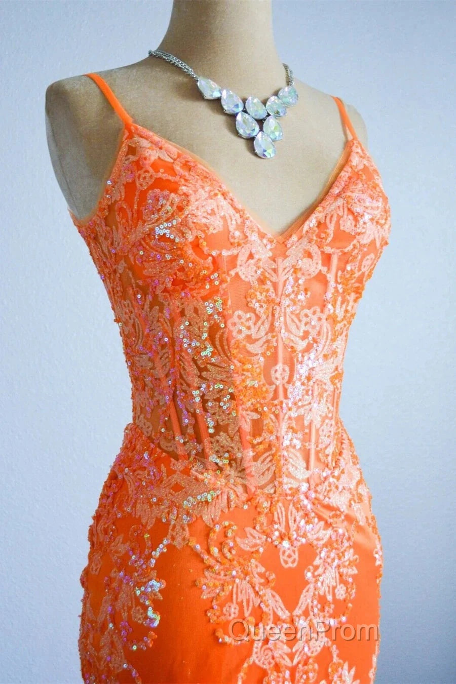 Orange Mermaid Spaghetti Straps Sequins Applique Long Evening Prom Dresses Tulle Evening Dresses