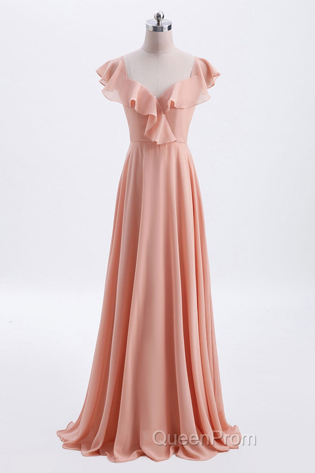 Peach Ruffles A-lline Chiffon Long Bridesmaid Dresses with Tie Back