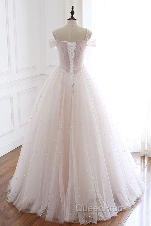Pearl Pink Straps A Line Tulle Long Evening Prom Dresses with Pearls, Long Formal Gown